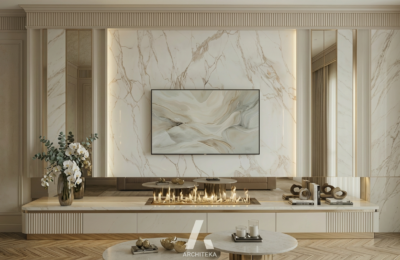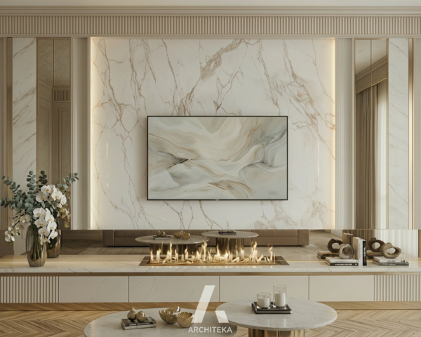 Ten projekt został zbudowany na wyraźnej osi kompozycyjnej i precyzyjnie zaplanowanych proporcjach. Centralny punkt przestrzeni porządkuje układ i nadaje mu spokojny, elegancki charakter, a zastosowane materiały tworzą wrażenie ciągłości i harmonii. Subtelne światło podkreśla strukturę ścian i detale, nie dominując nad całością. Każdy element został zaprojektowany z myślą o równowadze między estetyką a funkcją, dzięki czemu wnętrze pozostaje reprezentacyjne, a jednocześnie komfortowe w codziennym użytkowaniu. To przestrzeń, która sprzyja wyciszeniu i świadomemu doświadczaniu domu.