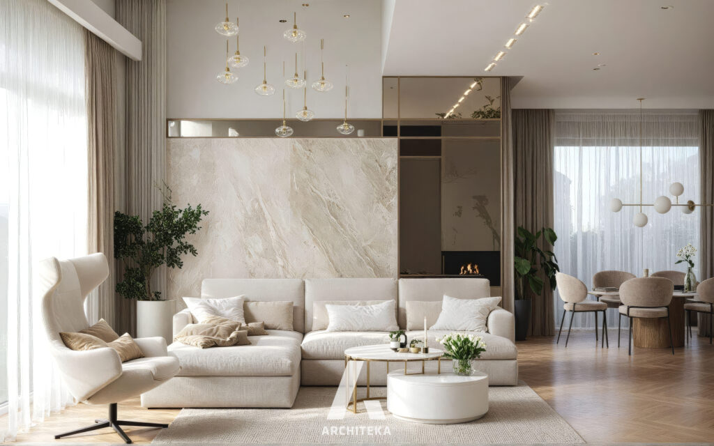 Ideą tego projektu jest stworzenie wnętrza, który będzie połączeniem nowoczesności i funkcjonalności w tonacji beżu i bieli nawiązując do stylu Modern Beige.