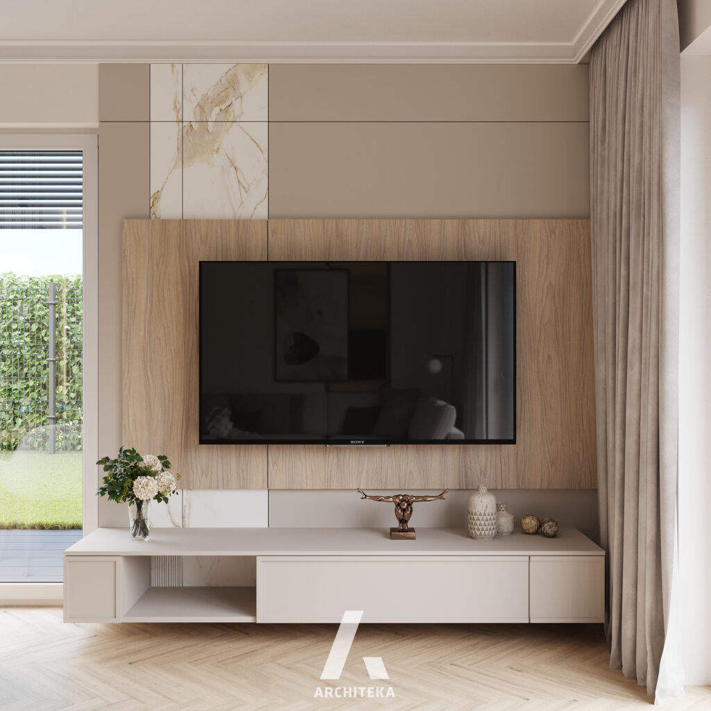 Ten projekt został zaprojektowany jako ciepła i uporządkowana przestrzeń do codziennego wypoczynku. Naturalne materiały i stonowana kolorystyka budują atmosferę spokoju, a proste, horyzontalne linie porządkują wnętrze i nadają mu czytelny układ. Zabudowa została zaplanowana tak, aby łączyć funkcję przechowywania z estetyką, bez wizualnego przeciążenia. Subtelne światło i dopracowane detale podkreślają faktury materiałów, tworząc wnętrze sprzyjające wyciszeniu i komfortowi na co dzień.