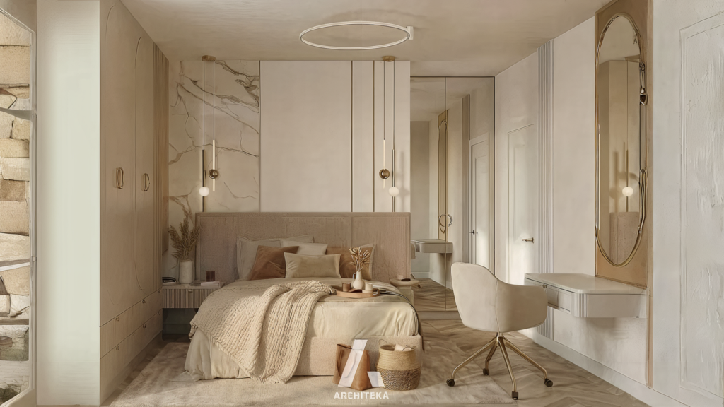 Ten projekt został zaprojektowany jako spokojna, prywatna przestrzeń sprzyjająca regeneracji i wyciszeniu. Jasna, ciepła kolorystyka oraz miękkie materiały budują poczucie komfortu i bezpieczeństwa, a dopracowane detale porządkują wnętrze bez wrażenia formalności. Układ został zaplanowany tak, aby codzienne funkcje były intuicyjne i naturalnie wpisane w przestrzeń, bez zbędnych podziałów i nadmiaru elementów. To wnętrze, które pozwala zwolnić tempo, odpocząć i poczuć równowagę na co dzień.