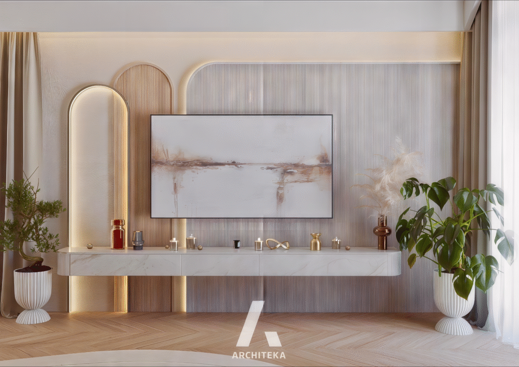 Zaprojektowane wnętrze emanuje harmonią i nowoczesną elegancją. Dominują tu proste, geometryczne formy oraz spójne zestawienia barw, które tworzą przytulną, a zarazem wyrafinowaną przestrzeń. Stonowane odcienie beżu i ciepłych tonów drewna zostały przełamane subtelnymi czarnymi i złotymi detalami, nadając aranżacji lekkości i ponadczasowego charakteru.