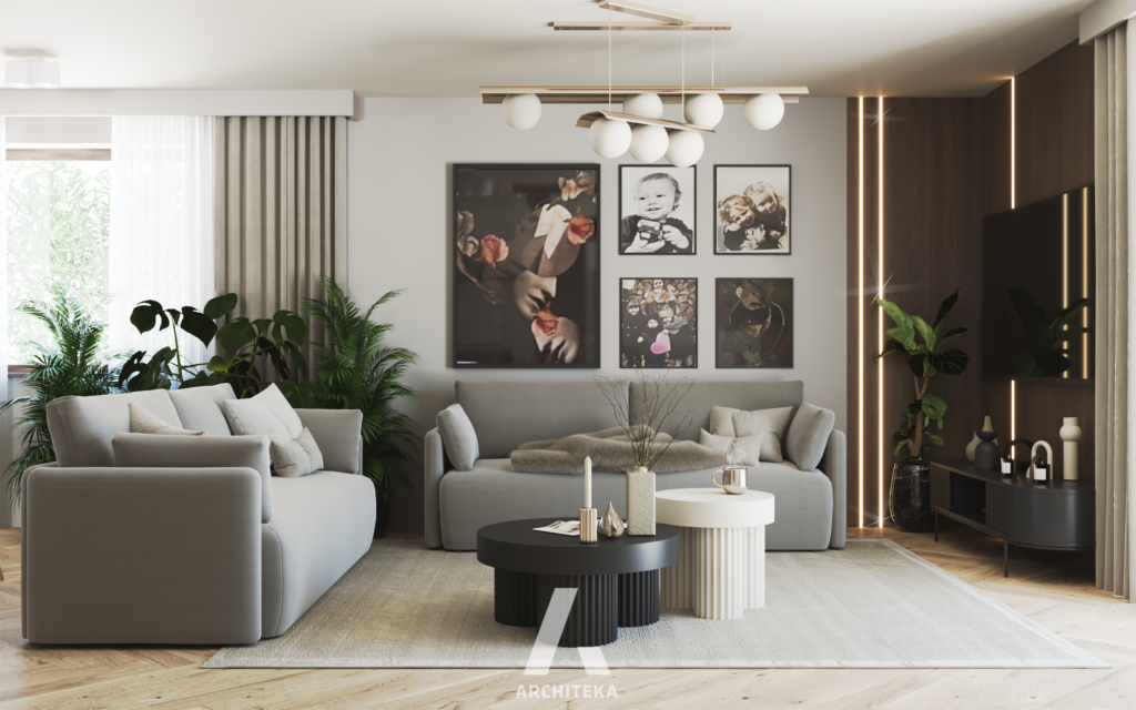 Ideą tego projektu jest stworzenie wnętrza, który będzie połączeniem nowoczesności i funkcjonalności w tonacji beżu i bieli nawiązując do stylu Modern Beige.