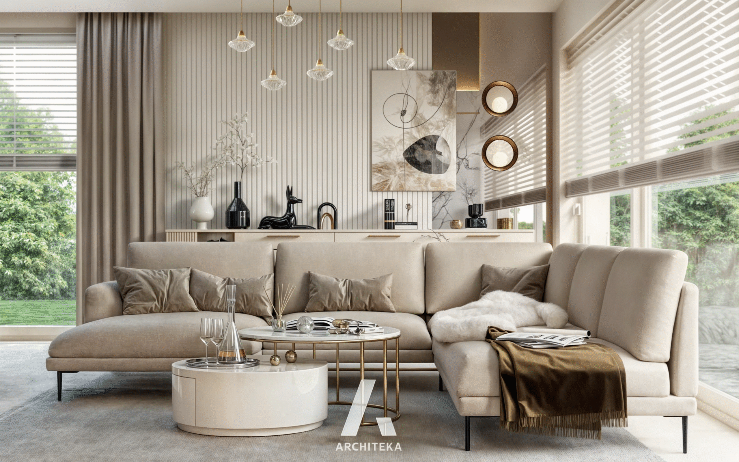 Niecodzienny projekt wnętrza domu w stylu Modern Beige. Nie lada wyzwaniem była aranżacja wysokiej ściany w salonie.