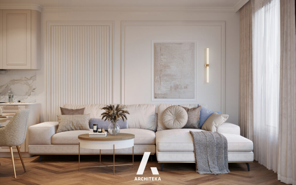 Projekt wnętrza unikatowego i reprezentacyjnego, niezwykle eleganckiego. Utrzymany w jasnych odcieniach, a przełamany wyszukanym połączeniem materiałów i faktur. Przyjemne i neutralne biele i beże, obecne już w podłodze wykonanej z paneli winylowych dodadzą wnętrzu niezbędnej równowagi.