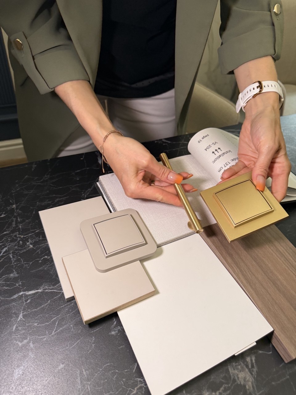 W naszej pracowni znajdziesz pełną bibliotekę materiałów — blaty, forniry, lakierowane fronty, kamień, szkło, tkaniny i systemy okuć.